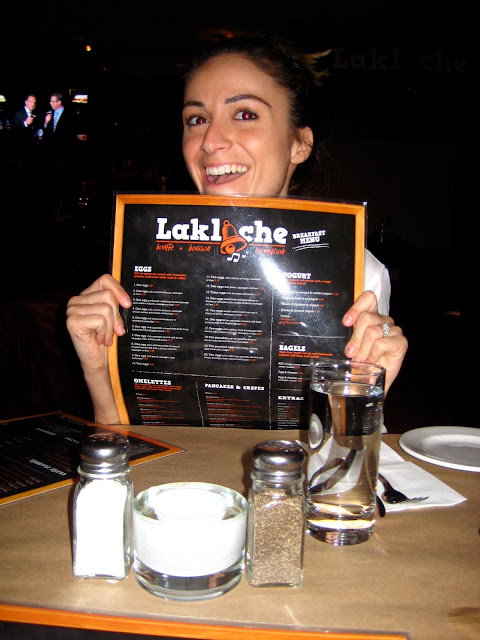 Andrew and I decided to try out our neighbor's new restaurant tonight, Lakloche, located in the Mile-End district of Montreal. It's a pub with class. Great music playing in the background, it's as if they had borrowed my i-pod. Vintage Madonna, The Clash, Michael Jackson, Bob Marley, etc. And to make the guys happy, hockey playing on a big screen with the sound off of course in order to hear the amazing play-list. While I was dancing away on my chair having my strawberry martinis, Andrew had one hand filled with a glass of beer and his eyes glued to the screen behind me.