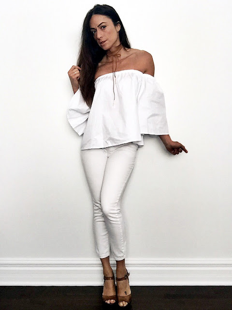 The weather today was unlike your typical June hot sunny day. It was windy, cold and rainy. However this beautiful white off shoulder top could not wait to make its debut. I froze my buns off but at least I looked pretty doing it :)